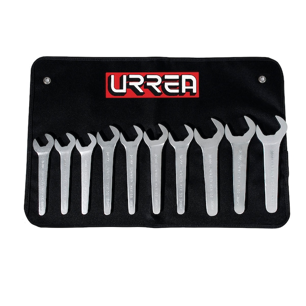 Set of 10 pieces with thin design facilitates work" hard to reach places. Polished satin finish. 30° opening. Satin finish handle protects against corrosion. Exceed ASME B107.100 standard. Wrenches sizes included: 19 mm, 21 mm, 22 mm, 24 mm, 27 mm, 30 mm, 32 mm, 36 mm, 37 mm, 38 mm.