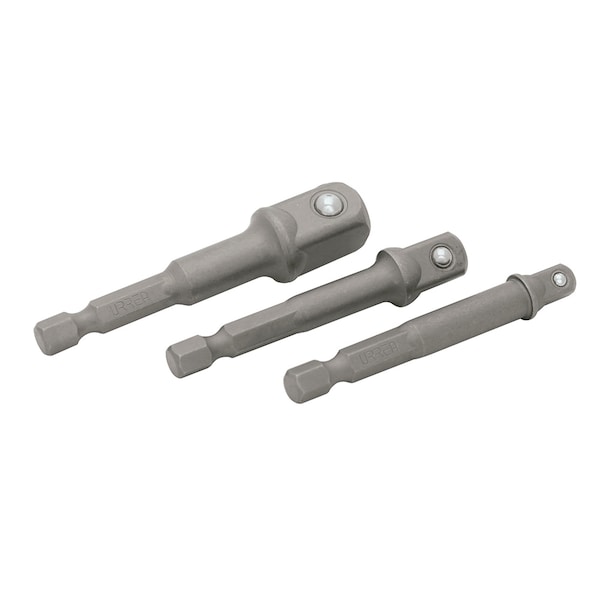 1/4”, 3/8” and 1/2” male squares. Spring-loaded ball bearing locks onto socket power extension socket adapter set. Description: 1/2” x 2.83”, 3/8” x 2.56”, 1/4” x 2.56”.