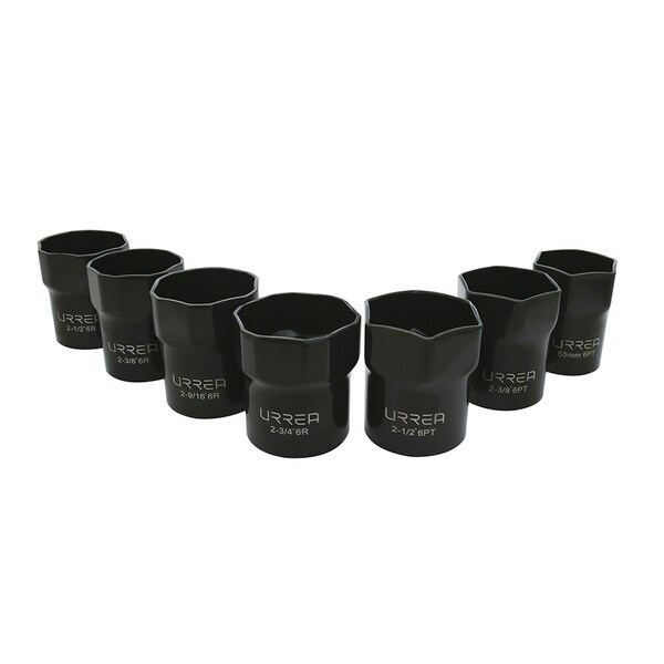 Avoids damage on locknuts. Rounded hex locknut (6R). Hex locknut (6PT). The set includes: 55 mm Hex locknut socket designed for use on front wheel adjusting nuts found on Toyota models FJ, LN and RN. 2-3/8” Hex locknut socket works on 1984-92 Ford Rangers and Broncos IIs with automatic locking hubs. 2-1/2” Hex locknut socket fits the hex nut found on rear axles and various front axle applications on light-duty trucks. 2-1/2" Rounded hex locknut socket works on 1995-96 Ford F-150 trucks and full-sized Broncos with automatic locking hubs. 2-3/4” Rounded hex locknut socket works on 3/4-ton, 1-ton Ford F-250 and F-350 trucks with automatic locking hubs. 2-9/16” Rounded hex locknut socket works on 1990-93 Dodge trucks with Dana 60 manual hubs. 2-3/8" Rounded hex locknut socket works on 1990-newer Ford Rangers, Broncos IIs, and Explorers with automatic locking hubs.