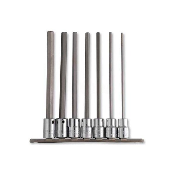 Urrea hex tip socket set, 4990-7l, 3/8" drive, 7 pieces, w/clips & rail long hexagonal tip sockets 1/8" to 3/8", 3/8" drive, on rail and clips in blister pack. 7-piece set includes: 3/8" 5/16" 1/4" 7/32" 3/16" 5/32" 1/8"