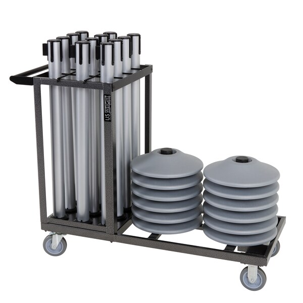 The US Weight Statesman Stanchion Cart Kit is the complete package for your crowd control needs. This bundle includes 12 US Weight Premium Steel stanchions with black belts that can quickly be assembled or deployed with their Sta-Straight technology along with one deluxe cart. This cart can quickly be loaded and easily maneuvered by a single person without additional help needed. The US Weight Stanchion Cart can transport up to (12) US Weight Premium Stanchions. Large 5-inch diameter wheels make for smooth rolling and easy turning and features two swiveling wheels with locking mechanisms to keep cart stationary when desired. The cart offers an attractive and durable powder-coated hammer tone finish. The main frame components are welded on three sides for added strength. A post divider rack has a durable yet flexible finish that helps protect stanchion finish during transport. US Weight, located in Olney, Illinois, makes event setup and teardown easy with the Statesman Stanchion Cart Kit. Cart assembly required