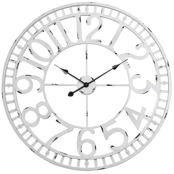 This high-quality industrial wall clock with a brushed metal finish clock face will add style...and allow you to be timely! Its large size and unique look will be sure to make a statement. Use in your living room dining area foyer or bedroom as a great decor accent! It makes for a great wedding shower or housewarming gift too!Solid iron metal constructionDistressed white finishPowered by 1 AA battery (batteries not included)No cords or wiring!Size: 32" Diameter5 lbs.USA/Woman Owned and Operated Free & Fast Shipping.