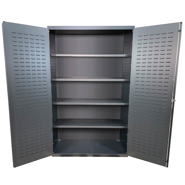This shelf only style cabinet has louvered bin brackets on the full-length of the door. These louvers are used to easily hang plastic storage bins for convenient and organized access to parts and supplies. (4) Shelves are included, easily adjustable on 7 3/8” increments, and with a 1,000 lb. capacity each. Shelves are 18” deep to allow room for bins on doors to be unobstructed when closed. Doors utilize premium full length piano hinges to maximize the stability, durability, and longevity of the cabinet. The convenient handle with 3-point locking system helps keep supplies, inventory and other valuables secure (keys included). Additional accessories are sold separately.