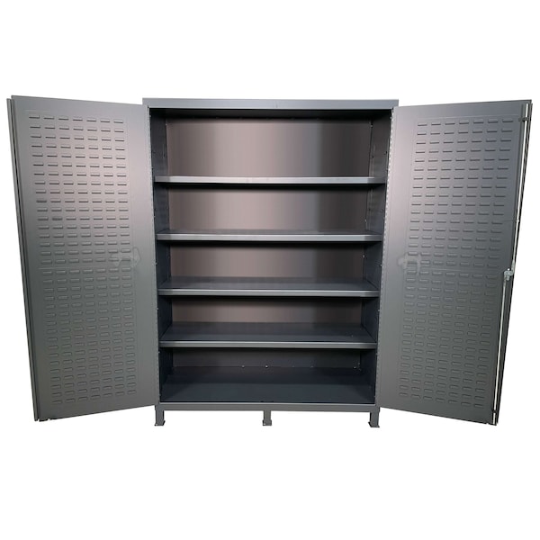 This shelf only style cabinet has louvered bin brackets on the full-length of the door. These louvers are used to easily hang plastic storage bins for convenient and organized access to parts and supplies. (4) Shelves are included, easily adjustable on 7 3/8” increments, and with a 1,000 lb. capacity each. Shelves are 18” deep to allow room for bins on doors to be unobstructed when closed. Doors utilize premium full length piano hinges to maximize the stability, durability, and longevity of the cabinet. The convenient handle with 3-point locking system helps keep supplies, inventory and other valuables secure (keys included). Additional accessories are sold separately.