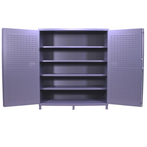 This shelf only style cabinet has louvered bin brackets on the full-length of the door. These louvers are used to easily hang plastic storage bins for convenient and organized access to parts and supplies. (4) Shelves are included, easily adjustable on 7 3/8” increments, and with a 1,000 lb. capacity each. Shelves are 18” deep to allow room for bins on doors to be unobstructed when closed. Doors utilize premium full length piano hinges to maximize the stability, durability, and longevity of the cabinet. The convenient handle with 3-point locking system helps keep supplies, inventory and other valuables secure (keys included). Additional accessories are sold separately.
