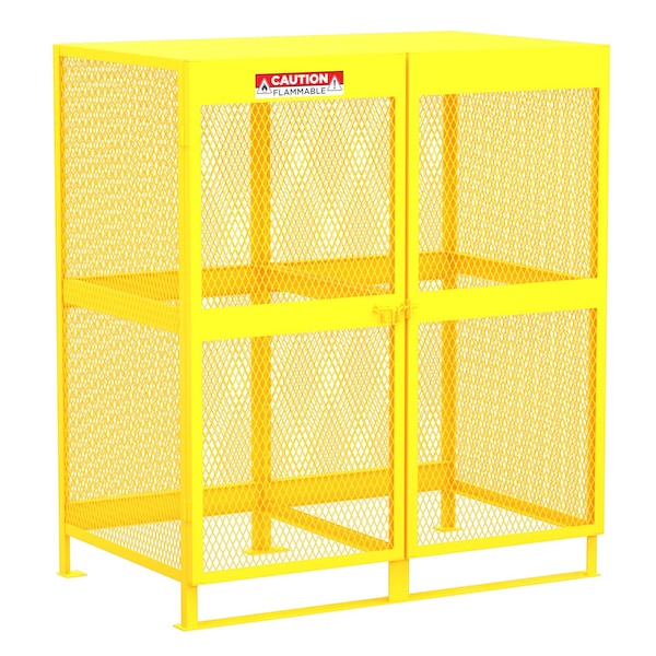 This rugged cabinet stores up to 20 gas cylinders. Storage is compatible with a variety of propane cylinders up to 200 lbs. or 65” tall. Premium welds improve the structural durability, making your unit last for years to come. The steel mesh provides security while also offering ventilation and visibility to inventory. Easily keep unit secure using the padlockable hasp. High-vis flammable warning sign included.