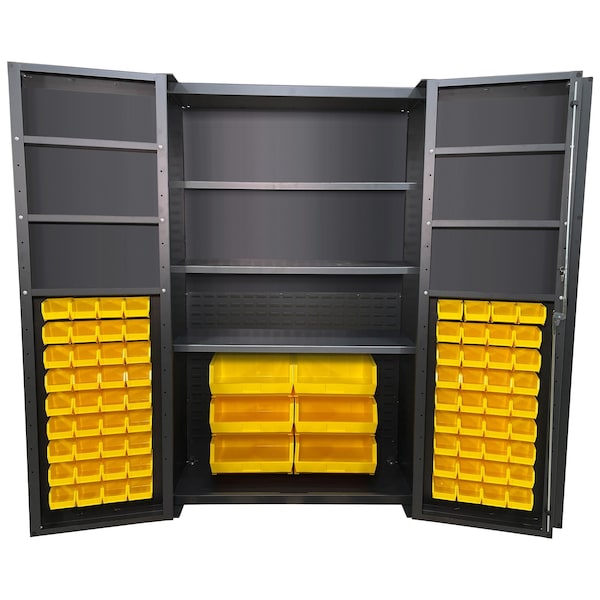 This half bins style cabinet has louvered bin brackets on the lower half of the door, and the lower half of the back. These louvers are used to easily hang plastic storage bins for convenient and organized access to parts and supplies. 78 bins are included: 72 XS for the doors, and 6 XL for the interior/back. (3) 18” deep interior shelves are included, easily adjustable on 7 3/8” increments, and with a 1,000 lb. capacity each. (6) 4” deep door shelves are included, easily adjustable on 4” increments, and with a 100 lb. capacity each. The convenient handle with 3-point locking system helps keep supplies, inventory and other valuables secure (keys included). Additional accessories are sold separately.
