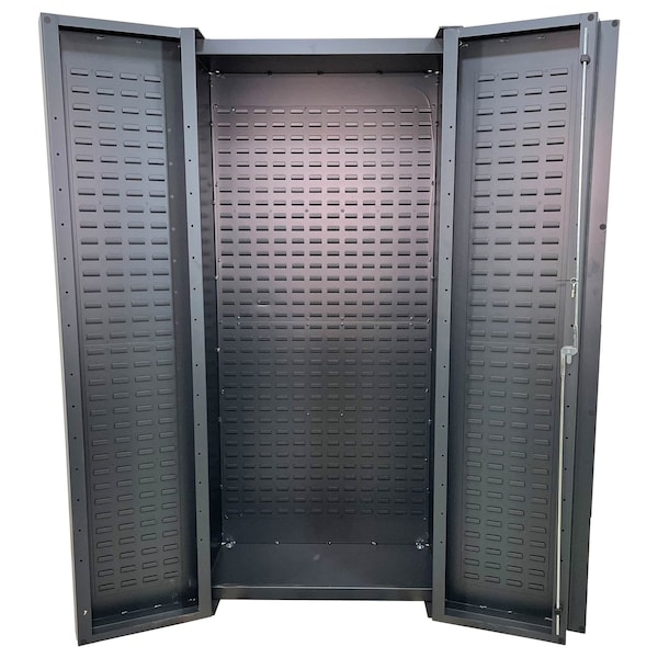 This base style cabinet has louvered bin brackets on the full-length of the door, and the full-length of the back. These louvers are used to easily hang plastic storage bins for convenient and organized access to parts and supplies. The convenient handle with 3-point locking system helps keep supplies, inventory and other valuables secure (keys included). Additional accessories are sold separately.