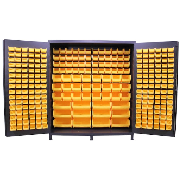 This full bins style cabinet has louvered bin brackets on the full-length of the door, and the full-length of the back. These louvers are used to easily hang plastic storage bins for convenient and organized access to parts and supplies. 204 bins are included: 168 XS for the doors, and 24 L/12 XL for the interior/back. Doors utilize premium full length piano hinges to maximize the stability, durability, and longevity of the cabinet. The convenient handle with 3-point locking system helps keep supplies, inventory and other valuables secure (keys included). Additional accessories are sold separately.