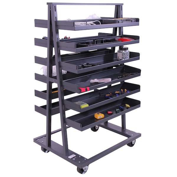 Valley Craft’s Double-Sided Heavy Duty A- Frame Cart provides mobile and customizable solutions for a variety of workstations and storage areas. This heavy duty 12 gauge, fully welded, cart is 38”W x 30”D x 63”H for optimal storage and handling. With a robust 2,500 lb. capacity, this Heavy Duty A-Frame Cart easily maneuvers on (4) 5” phenolic casters (2 rigid, 2 locking swivel). (12) Trays with front lip (1.5"H) are included and can be installed at any height to enhance workflow efficiency.