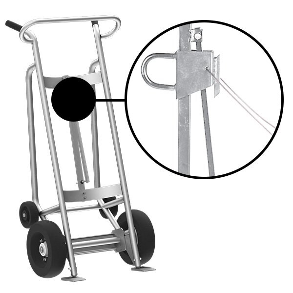 Aluminum frames are light weight making them easier to maneuver, and are spark resistant which is required for certain environments. The 4-wheel design increases safety while eliminating provides added stability control. (2) 12” front pneumatic wheels make handling heavy loads or maneuvering over various terrain simple. (2) 6” rear poly wheels improve stability and control. 1” steel axles are fully enclosed in a protective housing with sealed bearings to improve the durability, functionality, and longevity of your unit. The cable hoop adds an additional cable to the standard spring-loaded hands-free chime hook for additional security.