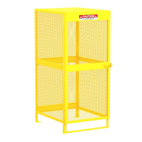 This rugged cabinet stores up to 10 gas cylinders. Storage is compatible with a variety of propane cylinders up to 200 lbs. or 65” tall. Premium welds improve the structural durability, making your unit last for years to come. The steel mesh provides security while also offering ventilation and visibility to inventory. Easily keep unit secure using the padlockable hasp. High-vis flammable warning sign included.