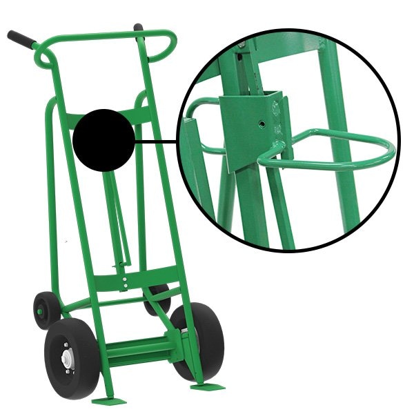 Heavy 14 gauge steel frames can handle the toughest, most rigorous use and environments, with a premium powder coat paint finish in green. The 4-wheel design increases safety while eliminating provides added stability control. (2) 12” front pneumatic wheels make handling heavy loads or maneuvering over various terrain simple. (2) 6” rear poly wheels improve stability and control. 1” steel axles are fully enclosed in a protective housing with sealed bearings to improve the durability, functionality, and longevity of your unit. The plastic drum chime hook drops over bung hole projection, specific to plastic drums only.