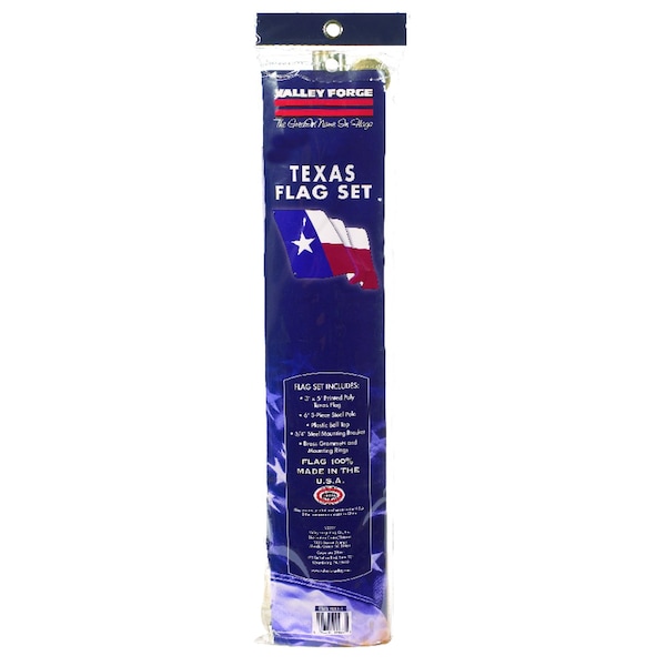 This Texas state flag kit comes complete with a 3 ft. by 5 ft. Printed polycotton Texas flag, a 6 ft. 3-piece steel pole and stamped steel bracket. Flag is 100%