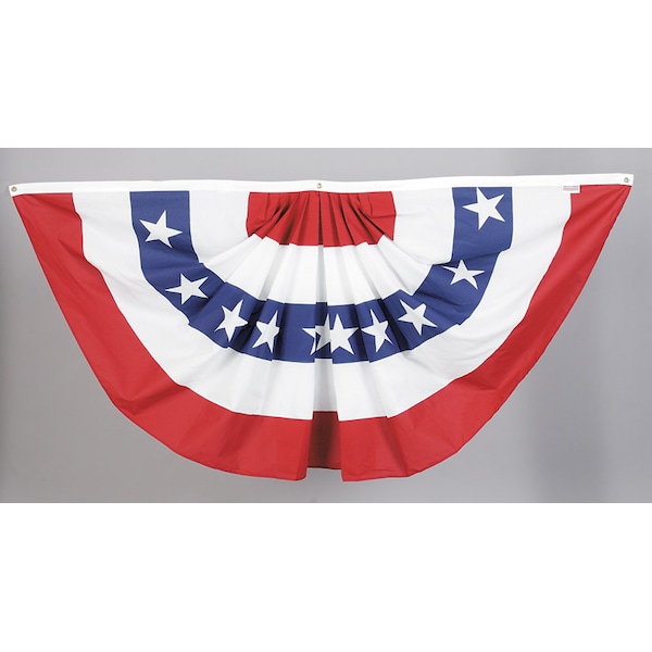 This decorative U.S. bunting measures 3 ft. by 6 ft., features three brass grommets and is constructed of printed polycotton. The fan flag features printed stars and stripes and is intended for occasional display on a deck, porch, or home.