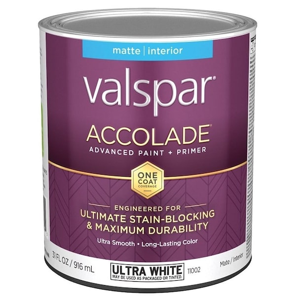 Accolade 1100 Latex Paint, Acrylic Base, Matte, Ultra White, 1 qt, Plastic Can