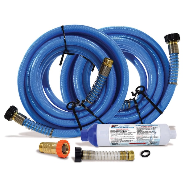 High Flow for Great Showers and More! Kit includes: Two Hi-Pressure Drinking Water Hoses with Metal Hose Savers, 5/8 x 25, Exterior Inline Water Filter with Hose Saver, and a Hi-Flow Water Regulator. Not recommended for older RVs.