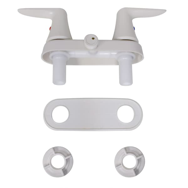 2 Valve; Single Piece Wall Mount; 4 Inch; 2 Lever Handles; White; Plastic Underbody; With Vacuum Breaker To Attach Hand-Held Shower Hose; With Individual Box