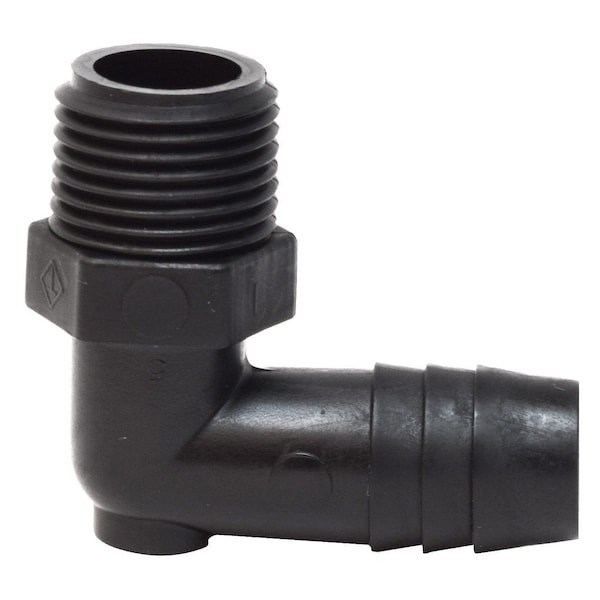 90 Degree Elbow Male Adapter; 3/8 Inch Male NPT x 1/2 Inch Barb; Plastic; Without Retail Package
