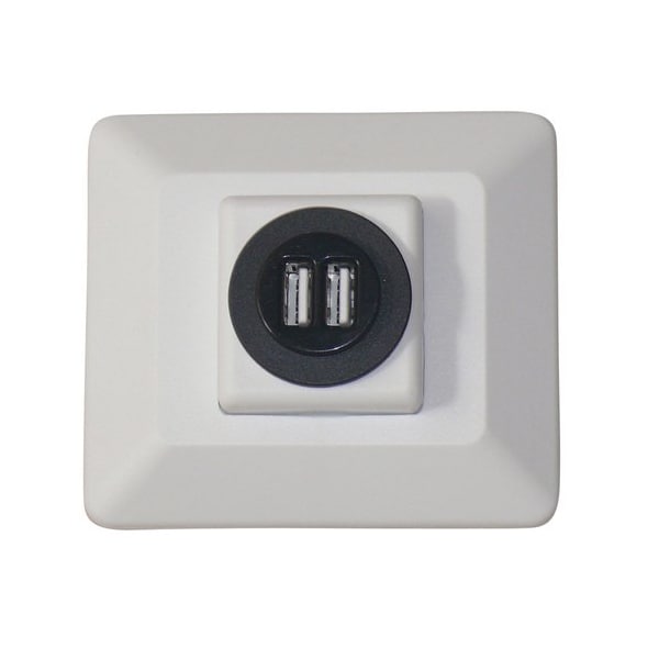 For USB Charging; Square; 3-7/8 Inch Length x 3-1/2 Inch Width x 2-1/4 Inch Thick; 2 Power Ports; White; With Decorative Bezel Mount; 12-Volt/ 2.1-Amp