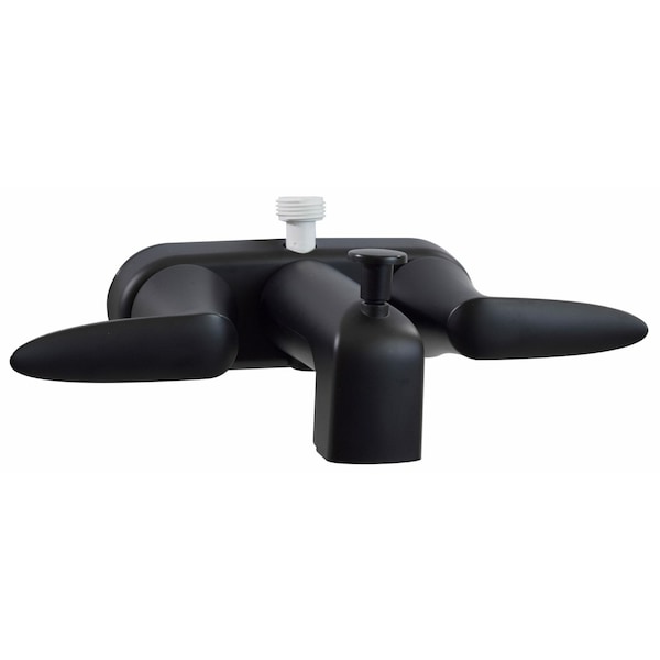 Used For Bathtub; Single Piece 4 Inch Wall Mount With Tub/ Shower Diverter; 2 Lever Handles; Matte Black/ Plastic Underbody; 2 Hole Application; 1/4 Turn Washerless Valve; With D-Spud To Attach Hand Held Shower; With Individual Box