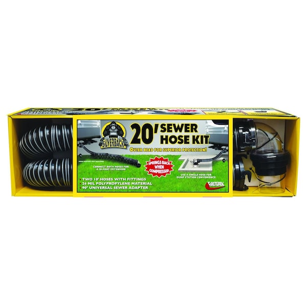 20 Foot Extended Length; 76 Inch Compressed Length; 3 Inch Diameter; 24 Mil Polypropylene; UV Protection; Silver/ Black; 100 Mil Protective Outer Beading; With Rotating Fittings/ 90 Degree Universal Sewer Adapter; Boxed