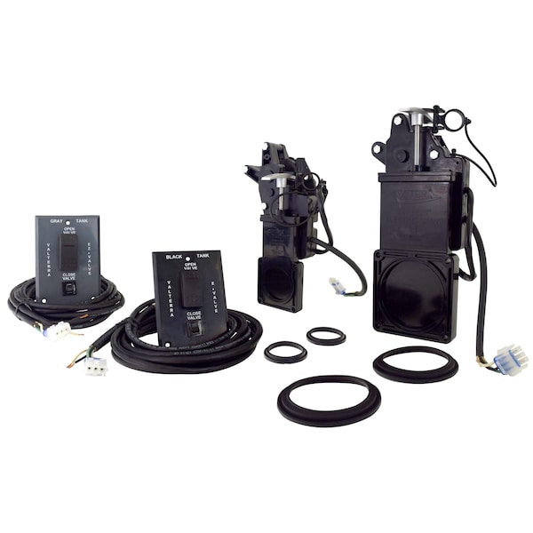 For RV Black And Gray Water System; Electric; 12 Volt/ 1.7 Amp Motor; Straight Valve; 1-1/2 Inch And 3 Inch Waste Valve; Without Fitting; With Handle; With Two Valve/ Two Breaker Reset Switch/ 4 Inch Valve Harness/ 3 Inch Switch Harness/ Manual Override