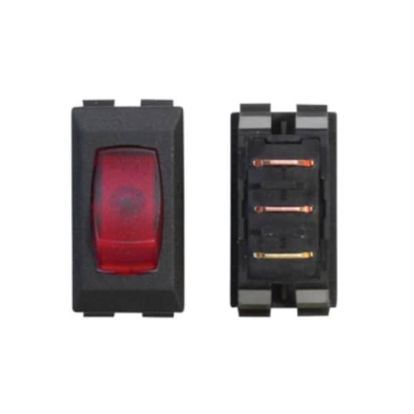 110 Volt; 6 Amp; Rocker; Single Pole Single Throw; 1.125 Inch x 0.55 Inch Cutout Size; 1.23 Inch x 0.68 Inch Overall Size; Light Illuminated; Red; Black Panel; 3 Per Bag