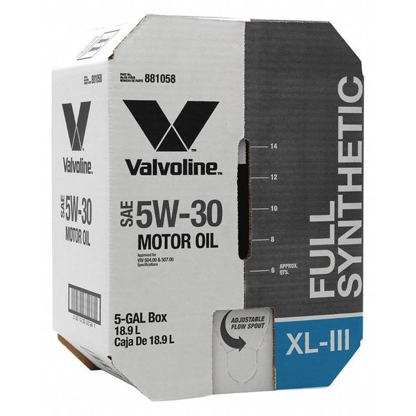 Engine Oil, Series European Vehicle XL-III, Container Size 5 gal, Compatible Vehicle Type Cars, Light Duty Trucks, Base Formulation Synthetic, SAE Viscosity Grade 5W-30, Standards API, SAE, Color Amber, Compatible Engine Type Gasoline Engines, Container Type Box, Flash Point 390 Degrees F, Maximum Operating Temperature 390 Degrees F, Minimum Operating Temperature -24 Degrees F, Pour Point -32.8 Degrees F, Viscosity @ 100 Deg C 12 cSt, Viscosity @ 40 Deg C 70 cSt, Viscosity Index 171