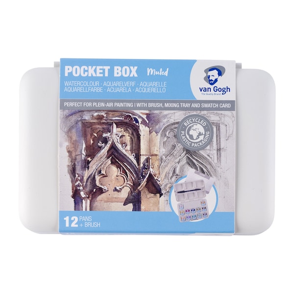 Van Gogh water colors are rated as a student and artist level paint range. They feature brilliant, transparent, and intense colors with high tinting strength. Most colors are rated with the highest degree of lightfastness +++ 100+ years under museum conditions with a few colors rated just one step below at ++ 25-100 years under museum conditions. Thanks to the purity and uniform viscosity, these water colors are easy to work with and easy to mix. Proudly produced in Holland with stringent quality control for a consistent experience with every purchase. This 12-half pan water color set is packed in a plastic pocket box, and also includes a round synthetic hair brush size 6 and a mixing tray. Colors in this muted selection set are: Titanium Buff 291, Naples Yellow Red 224, Gamboge 238, Yellow Ochre 227, Quinacridone Rose 366, Olive Green 620, Davy's Grey 748, Turquoise Green 661, Lavender 525, Indigo 533, Neutral Tint 715, Sepia 416.