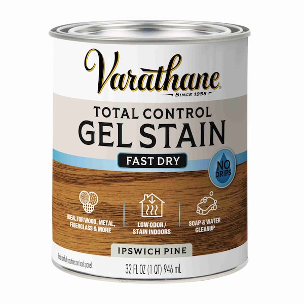 Varathane Total Control Gel Stain is a fast-drying, water_x0002_based stain that provides rich, even color. This easy-to-use formula is ideal for vertical surfaces such as doors, trim and banisters and can be applied to a variety of surfaces such as wood, metal, fiberglass and more. Varathane Total Control Stain has a thick consistency that will not drip or run. This low-odor formula cleans up easily with soap and water and can be used on both interior and exterior projects