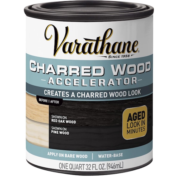 Varathane Charred Wood Accelerator creates a weathered charred black appearance on bare or untreated wood. It replicates the natural charring process by reacting with the tannins of the wood to create a unique one-of-a-kind blackened char color. Reacts with the wood and imitates the effect of torched wood finishes.