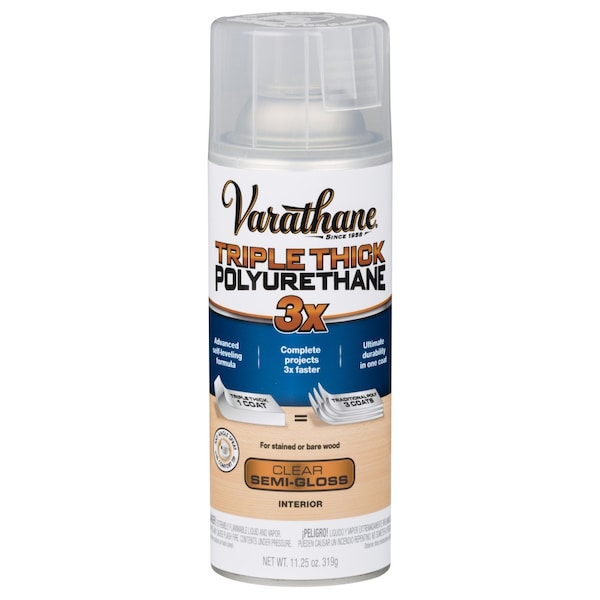 Varathane Triple Thick Polyurethane is 3X thicker than traditional polyurethane. It is an advanced self-leveling formula that allows projects to be completed in one coat while offering excellent scratch and stain resistance. It also provides fast dry times as well as the convenience of soap and water clean-up. It is suitable for use on all interior wood surfaces including furniture, doors, trim and more.