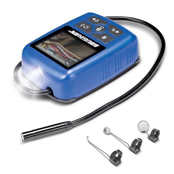 View and inspect just about anything, anywhere with the Vaughan Digital Videoscope and Borescope! It’s durable, compact and easy to use. The 18-inch long semi-rigid camera shaft stores inside the unit. When you’re ready to use the camera, unwind the cable and feed the 300 megapixel camera lens into an opening as small as 5/16” diameter. Then view and capture images on the 2-1/4” color LCD display. Adjust the built-in LEDs on the camera tip for more or less light. 4x zoom makes it easier to find and inspect fine details. There’s even a built-in work light on the camera body for illuminating dark worksites. Use the included attachable hook, magnet or mirror to help see and retrieve small objects. Store everything in the included pouch for safekeeping. • FITS IN YOUR POCKET OR POUCH: Compact, durable all-in-one design - small enough to fit in a shirt pocket so it's ready to use at a moment's notice • SEE WHAT YOU'RE MISSING: The semi-rigid 18-inch borescope shaft bends to your will, while the 4X zoom and adjustable LED lights at the tip make seeing what you're inspecting that much easier • FIND YOUR WAY: A built-in flashlight helps you find your way and your target in low light work areas • FIND IT AND GRAB IT: Use the attachable hook or magnet to retrieve small items (like wedding rings). Or attach the included mirror for a better viewing angle • STORE IT SAFELY BETWEEN USES: Use the included storage pouch to protect your borescope between uses • COLOR: Blue • MATERIAL: