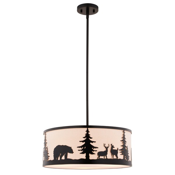 Embrace the serene whispers of the artfully crafted Acadia pendant to bring the essence of the wild into your home. The Acadia pendant's three lights and textured linen shade showcase bear and deer silhouettes set against a backdrop of evergreen trees. Perfect for kitchens or family rooms of cabins, lodges, or any home seeking to add a touch of nature and rustic ambiance.