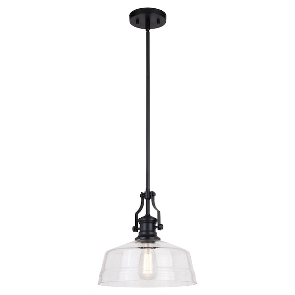 The Beloit pendant adds a welcoming and inviting feel to your kitchen or living spaces. Soft curving lines finished in matte black paired with a large clear seeded glass shade create a look that accents the most comfortable spaces. Combine that with a vintage Edison style filament bulb to complete the look. Bring a level of sophistication to your trendy farmhouse or urban style with this pendant.