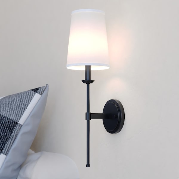 Camden 1 Light Matte Black Wall Sconce Fixture White Linen Fabric Shade, LED Compatible