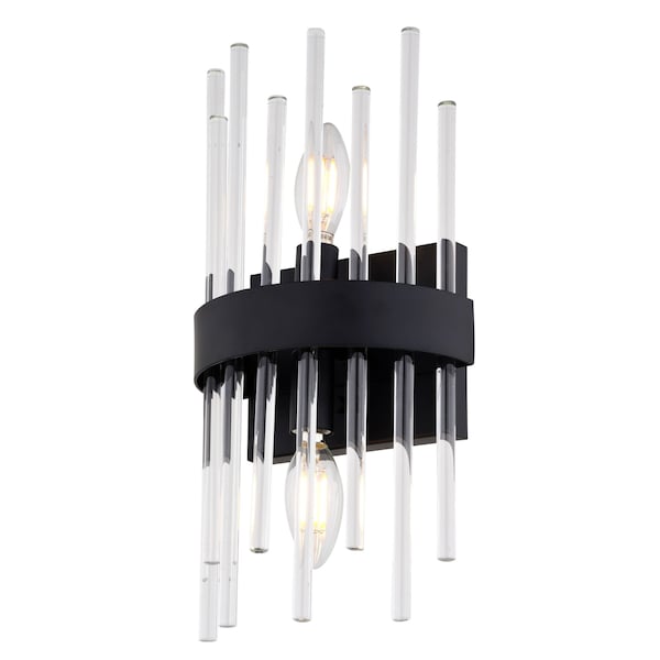 Embrace the sophisticated glamour of Art Deco design with the Delevan 14-inch wall light. This stunning fixture features sleek crystal rods set against a modern matte black finish, creating a luxurious focal point for any space. The popular crystal rod trend gets an updated twist with the Delevan's clean lines and elegant silhouette. Perfect for bathrooms, hallways, or dining rooms, this fixture adds a touch of timeless style to both contemporary and transitional interiors.