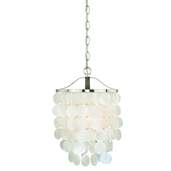 Soft contemporary styling combined with texture and iridescence. The Elsa collection pendant is a unique option for use above an eating area, or (in multiples above) an elongated island, or to accent a small room or foyer space. Tiers of hand-strung natural Capiz shells create a soft diffused light that perfectly compliments the satin nickel metal elements. This is a full collection with coordinating pieces to decorate any room in the house. Features medium screw base lamping; frosted bulb recommended for best appearance.