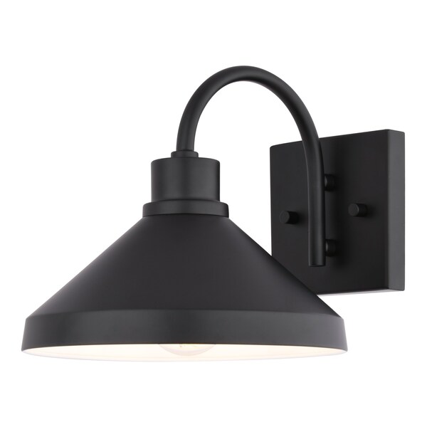 Transform your home's curb appeal with the Highland Park outdoor wall light, a stylish fixture that blends transitional and contemporary design. The sleek, angled matte black steel shade features a white interior, directing and amplifying light for bright, functional illumination. With its durable, wet rated construction, this light is perfect for withstanding the elements and bringing modern, welcoming style to your front porch, patio, or garage.
