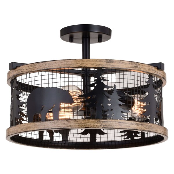 Kodiak 16-in W Black and Teak Rustic Semi Flush Mount Ceiling Light Bear and Tree Motif