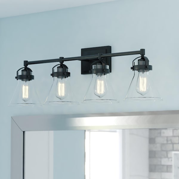 A nod to farmhouse and industrial aesthetics are realized in the Mason vanity collection. Charcoal black accents offer a striking contrast to each funnel shaped shade. As they sit perched along a horizontal support, a brilliant show of light pours from each shade, creating a bright shine on the subject below. This 4-light vanity is ideal in any bath, or interior space where extra light is welcomed.
