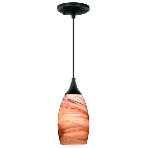 The Milano collection of mini pendant lights feature softly radiused hand-blown glass that gracefully blends into almost any decor. Because each glass is handcrafted utilizing century-old techniques, no two pieces are identical. The toffee swirl colored glass has tones of golden brown and orange and is housed in an oil rubbed bronze finish for a contemporary and artistic look. Install this mini pendant individually or in a group; ideal for kitchens, dining areas, or bar areas.