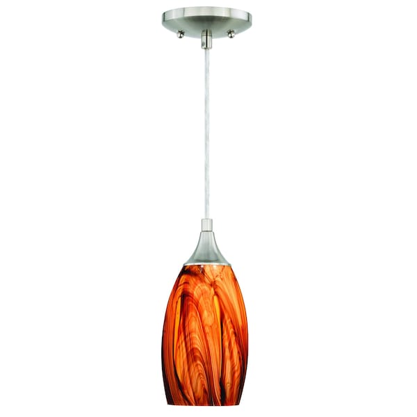 The Milano collection of mini pendant lights feature softly radiused hand-blown glass that gracefully blends into almost any decor. Because each glass is handcrafted utilizing century-old techniques, no two pieces are identical. The smoky fire colored glass has tones of red, orange, and black and is housed in an satin nickel finish for a contemporary and artistic look. Install this mini pendant individually or in a group; ideal for kitchens, dining areas, or bar areas.