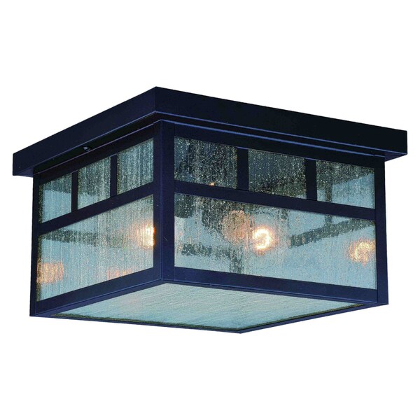 Flat strips of oil burnished bronze outline clear seeded glass panes in the Mission collection. The simple design of this fixture has a mission style look perfect for Frank Lloyd Wright prairie inspired decors. This outdoor ceiling light is ideal for your porch, entryway, or any other area of your home.
