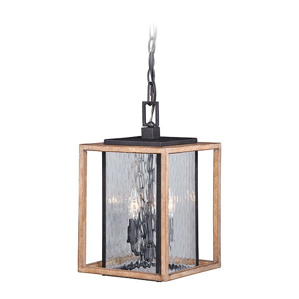 The marriage of the rustic outdoors with the coziness of indoors is illuminated with the Modoc outdoor pendant. A distressed oak finish encases the lantern, with its candelabra style lighting, ripple glass housing, and textured dark bronze structure. An ode to the mission or prairie styles of the past, this outdoor pendant keeps the lines clean with stunning sophistication.