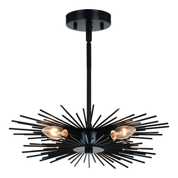 The Nikko collection is bursting with excitement and style. Matte black finished rods playfully radiate from the central band to create an interesting look. This mid-century modern look is a flirty throwback to a simpler age. With its personality and charm, the Nikko semi flush mount ceiling light feels like a familiar friend, sure to make a statement in any entryway, hallway, or bedroom.