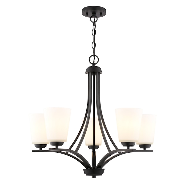 River Grove 5-Light Matte Black Chandelier, Frosted White Glass Shades