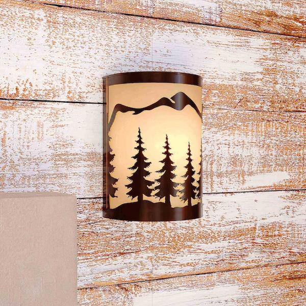 Evoking the spirit of the wilderness, this rustic themed light is clad in a burnished bronze finish and features silhouetted tree imagery atop glowing white tiffany style glass. It is a great choice for a vacation lodge, cabin or suburban home and will complement a variety of home styles: anywhere you want to bring an element of nature. This versatile light is outdoor damp rated and can be used indoors as well as outdoors. Mount these lights on your porch, hallway, or entryway and experience this stylish look for yourself.