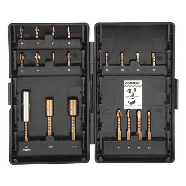 Driver Bit Set, No. of Pieces 19, Hex Shank Size 1/4 in, Fastening Tool Material Steel, Impact Rated Impact Rated, Impact, Includes 1/4 in Mag Nutsetter, 5/16 in Mag Nutsetter, Mag Bit Holder, Phillips #2 x 1 in (8), Phillips #2 x 2 in (2), Phillips #3 x 2 in, Square #1 x 1 in, Square #2 x 1 in (2), Square #2 x 2 in, Square #3 x 1 in, Bit Length 1 in, 2 in, 3 in